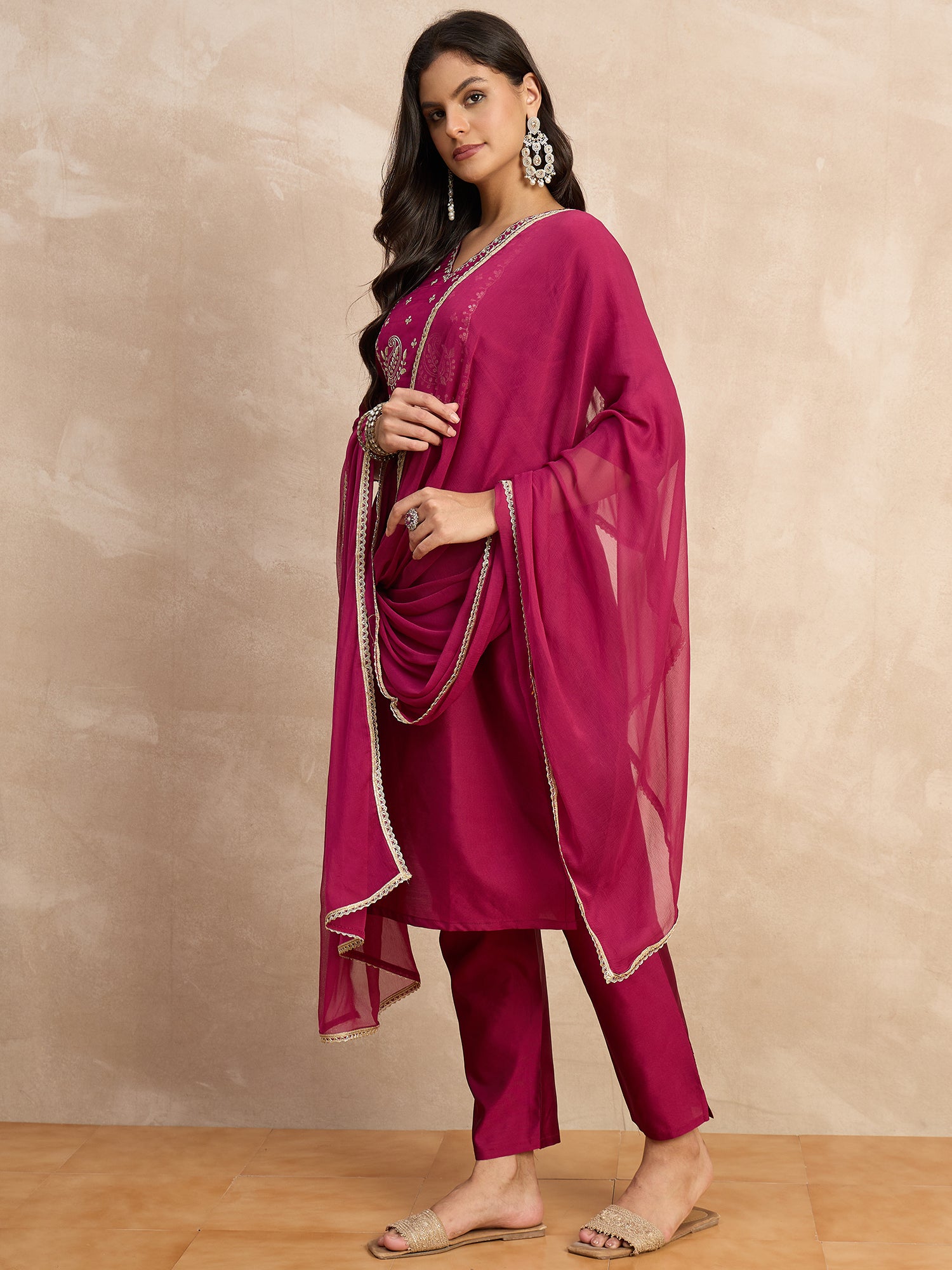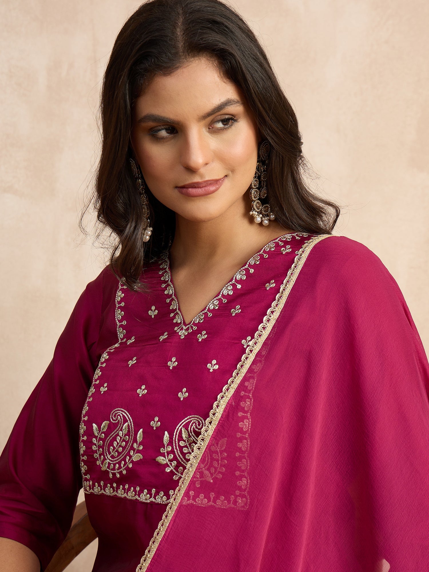 Aakar Purple Women's Silk Blend Embroidery Kurta Pant Set with Dupatta