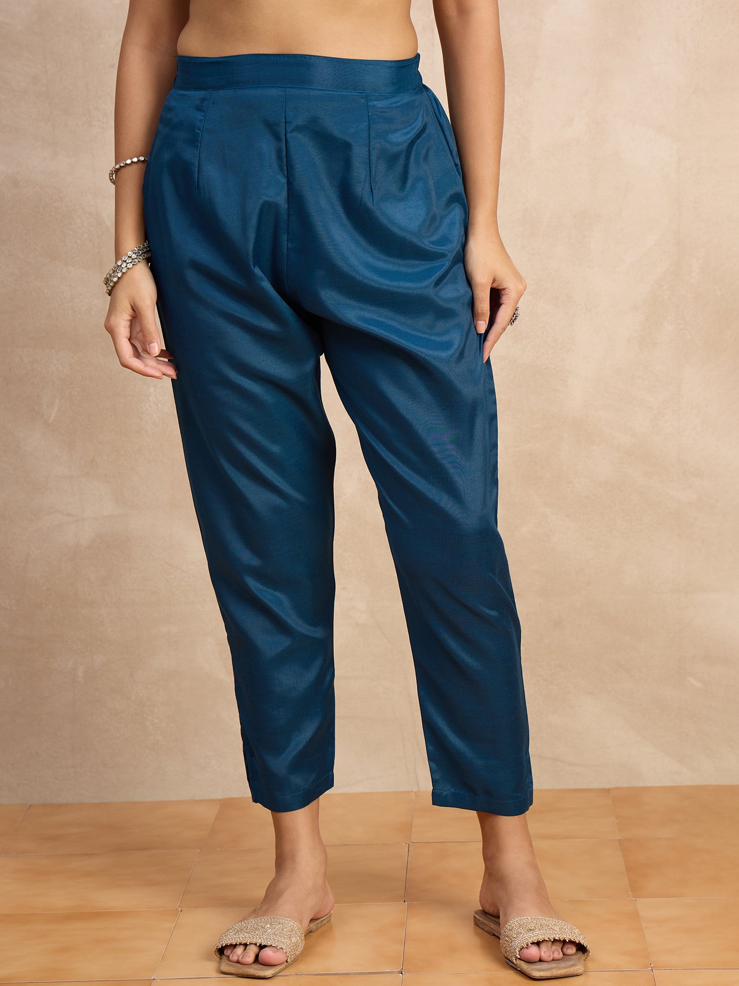 Paneri Teal blue Women's Silk Blend Banarasi Jacquard Zari Woven Straight Kurta Pant with Dupatta Set