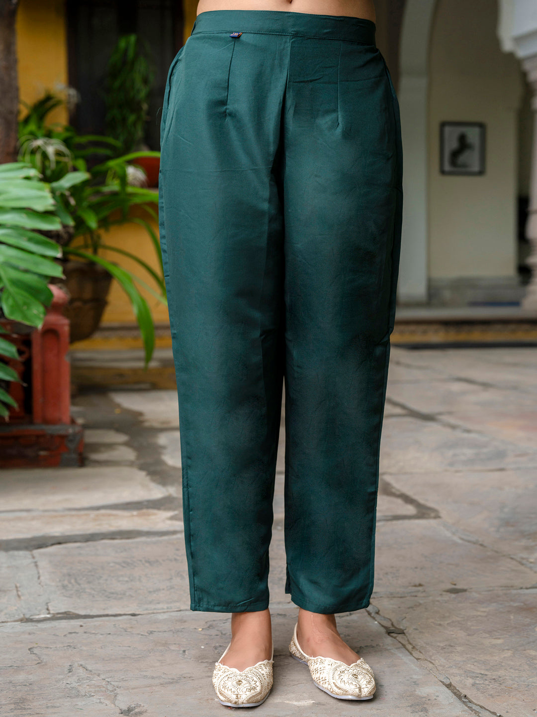 Dress up like a diva at the festive or party with this stunning three-piece kurta set for women. It’s made from chanderi modal Butti the set comprises an uber-stylish contemporary asymmetrical hemline kurta with three-fourth sleeves, wide-leg colour coordinating bottoms and statement Embroidered Chanderi Duppata. Elevate the ensemble with coordinating ethnic earrings and block heels.