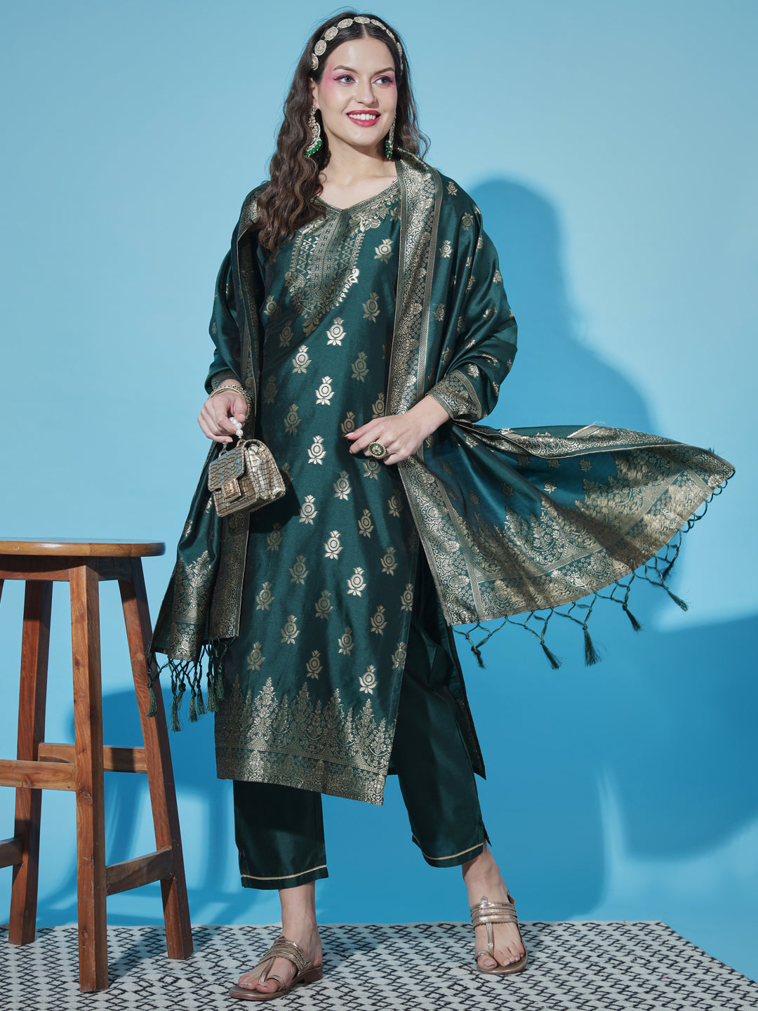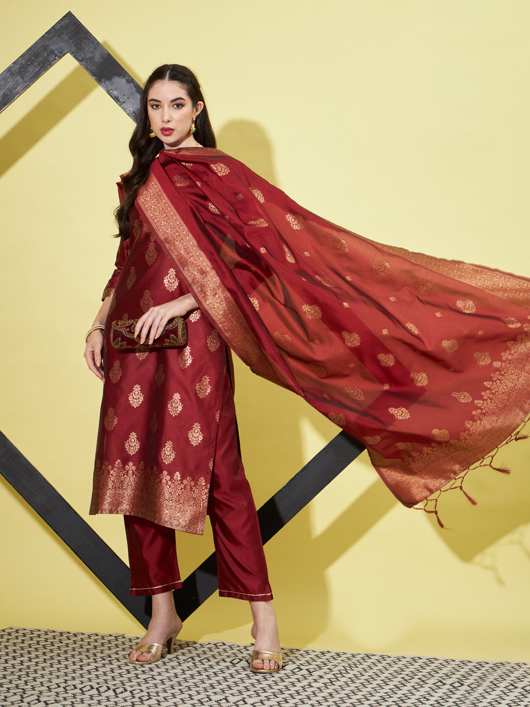 Pattern: Banarasi Woven Self Designed Multipack: 1 KURTA, 1 PANT, 1 DUPATTA Fit Type: Regular Fit Care Instructions: Dry Clean Only |