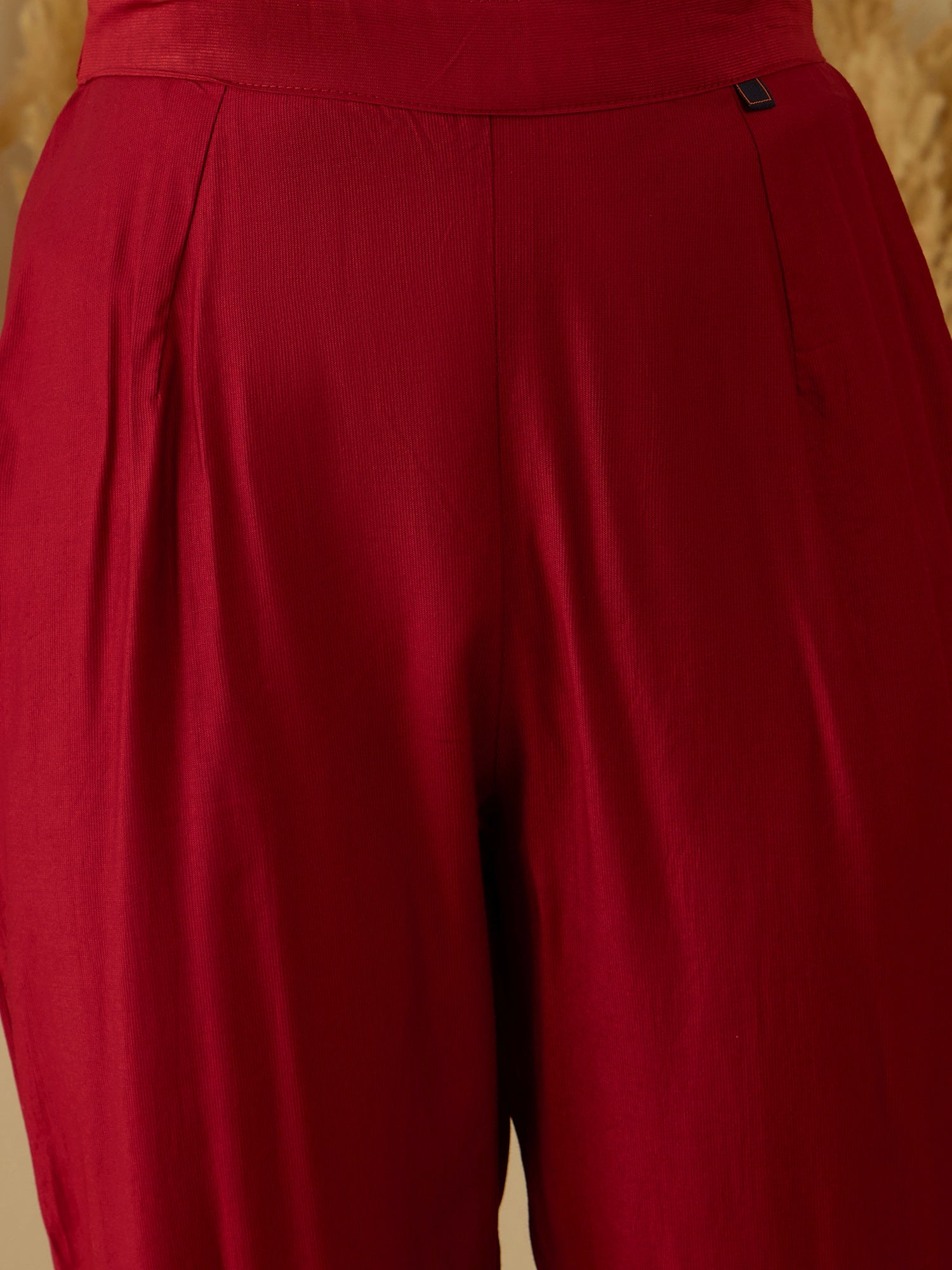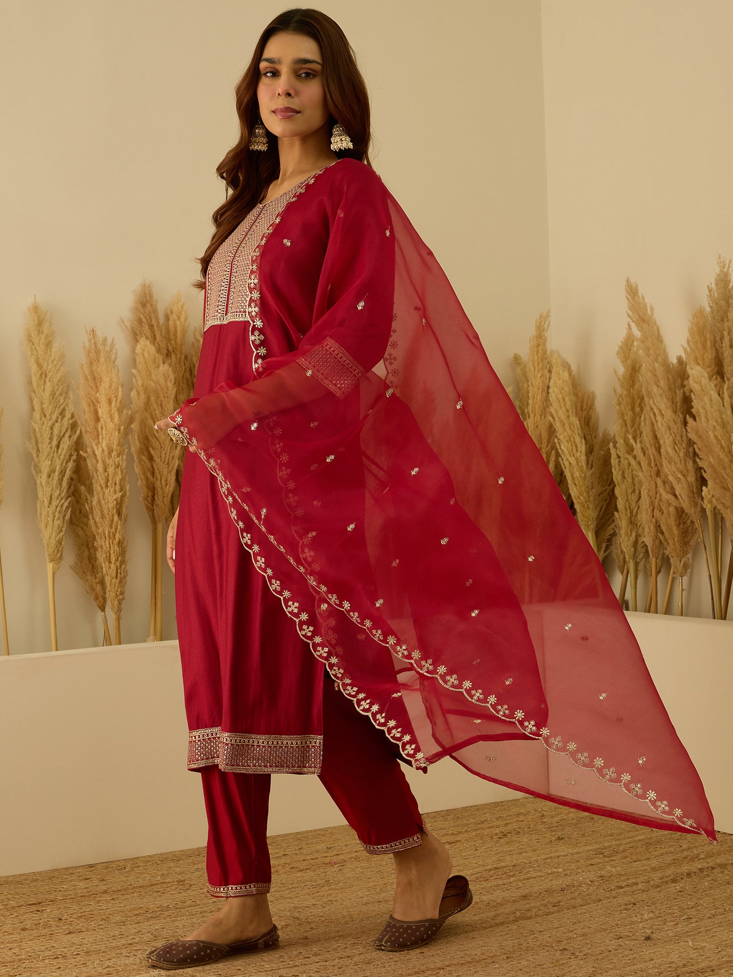 VredeVogel Red Viscose Rayon Embroidered with Sequins Straight Kurta Set with Trousers & Dupatta