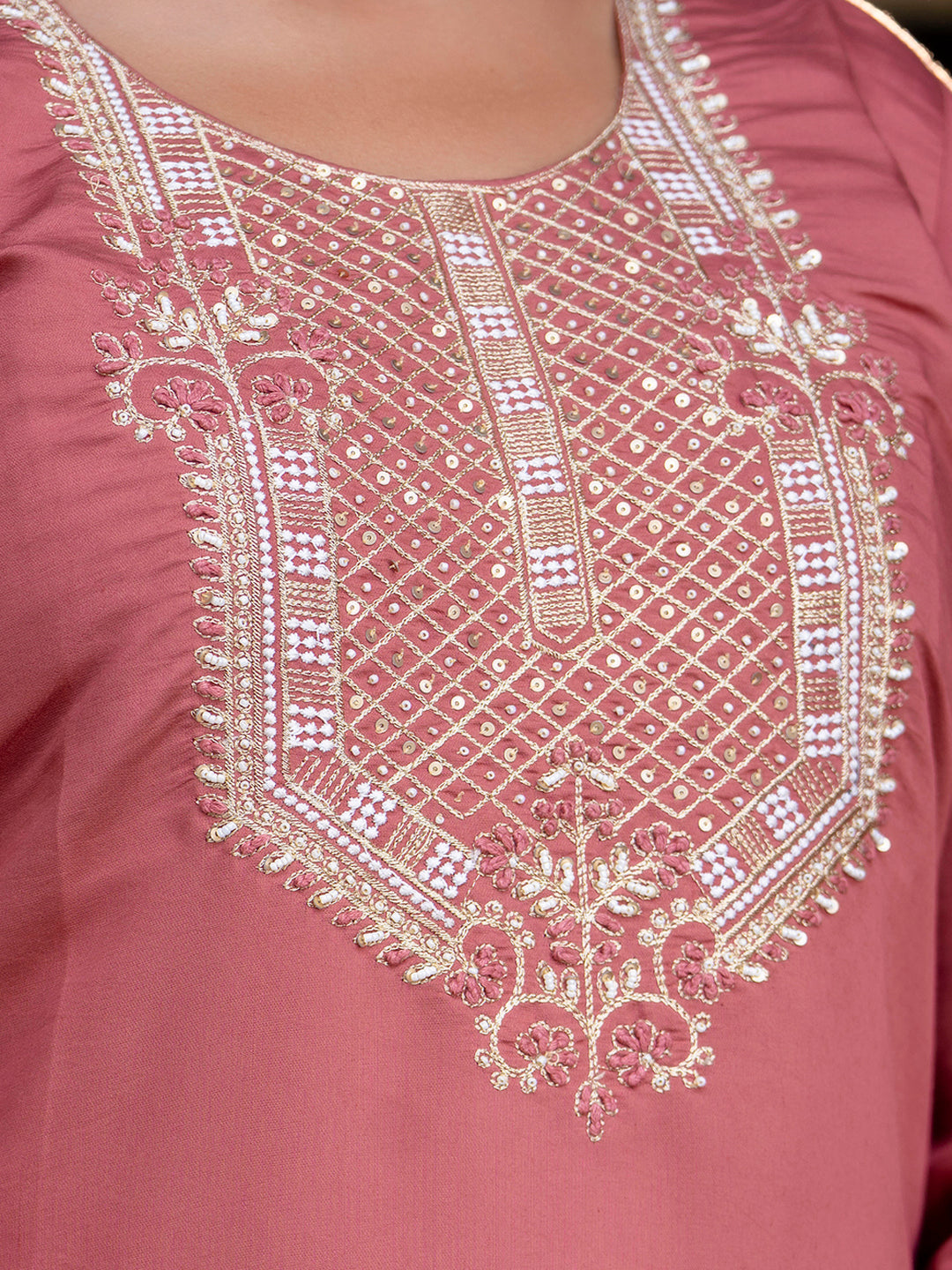 Deepanjali Women's Embroidered Silk Blend Calf Length Straight Kurta Trouser with Dupatta Set