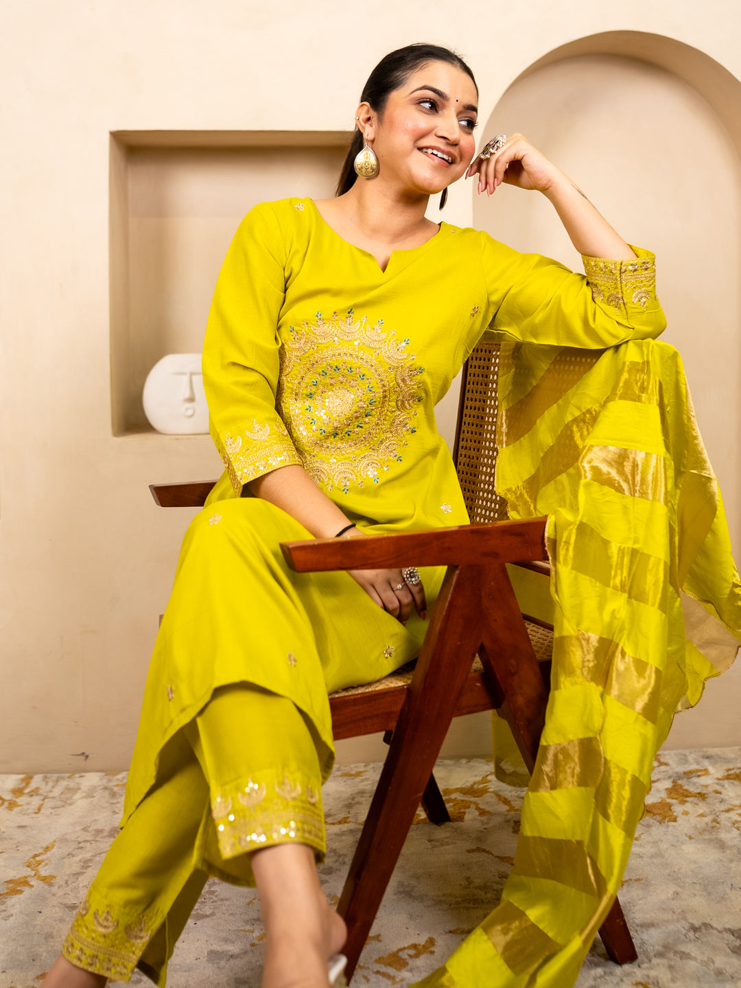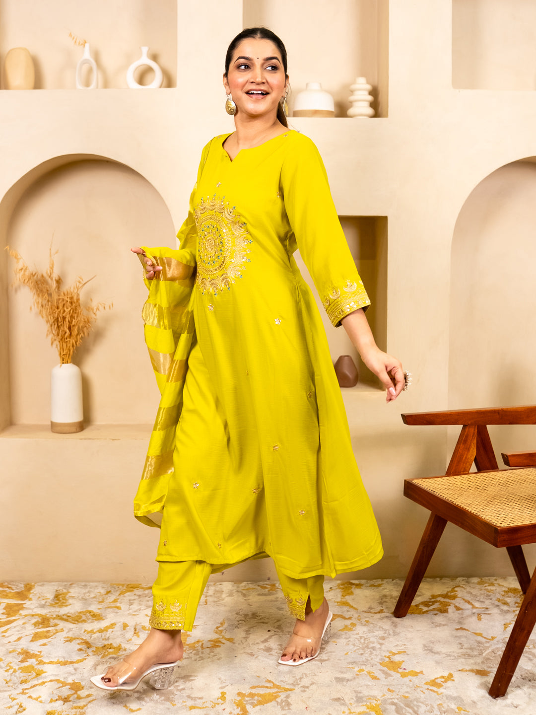 Myraa Lemon Women Kurta and Pant Dupatta Sets Chanderi Silk Fabrics with Embroidery